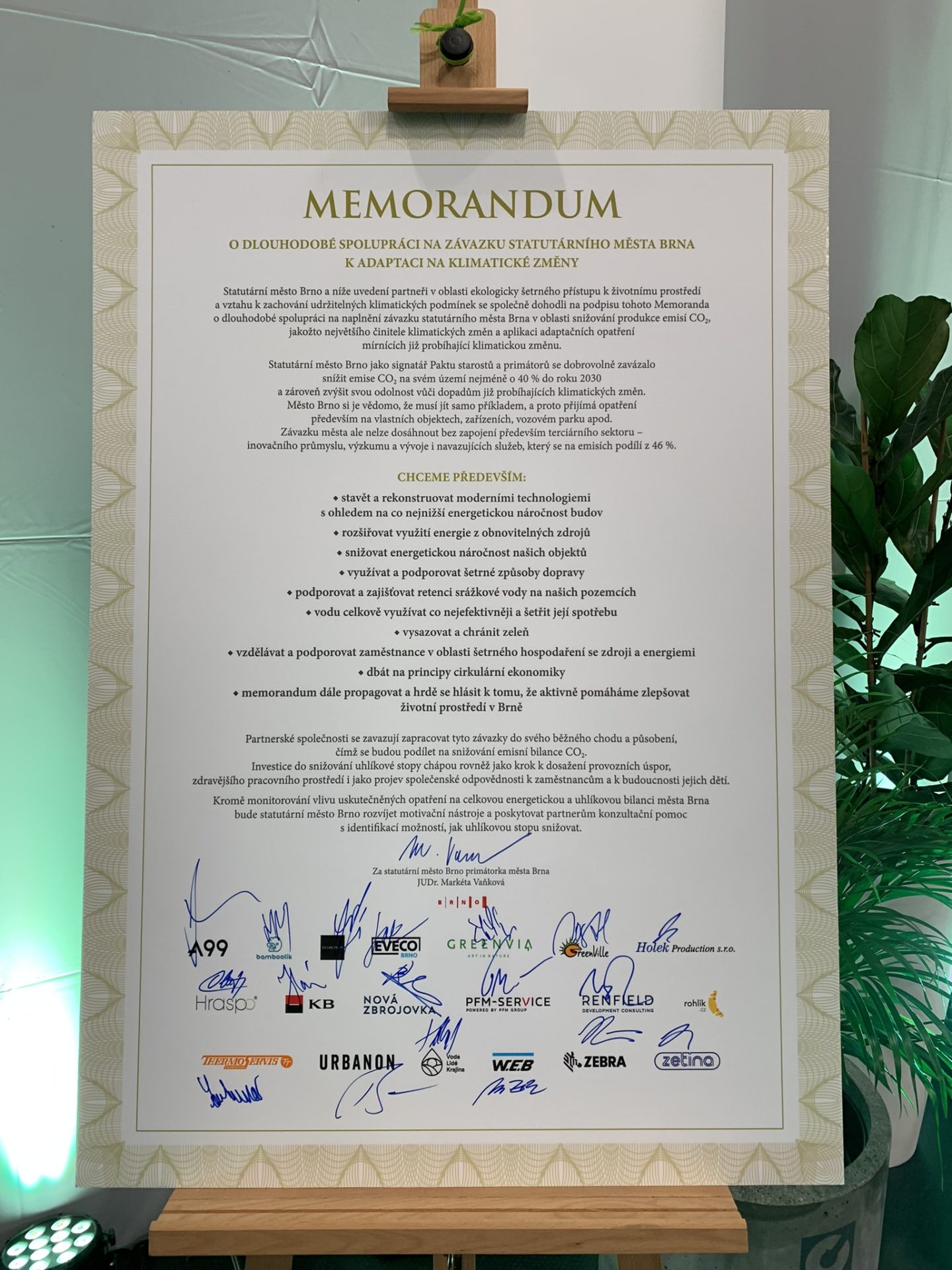 V rámci Festivalu architektury jsme podepsali Memorandum o snižování emisí CO₂ na území města Brna o 40 % do roku 2030. Jako odpovědná firma v rámci projektu #PripravBrno, jsme se zavázali dodržovat závazky plynoucí z Memoranda do našeho běžného chodu a působení.