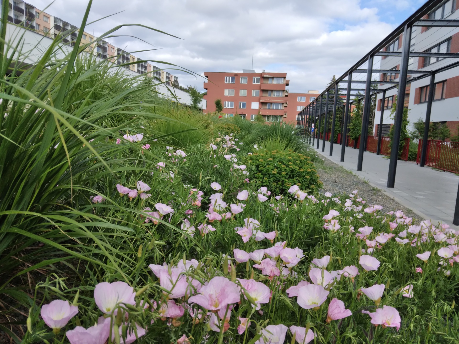 Na střeše podzemních garáží v brněnské městské části Lesná jsme vybudovali poklidnou střešní zahradu, která od jara do podzimu krásně kvete.