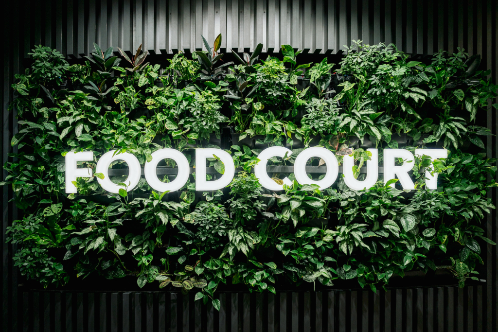 - zelenou obloukovou stěnu zasazenou v antracitových lamelách se světelným nápisem FOOD COURT