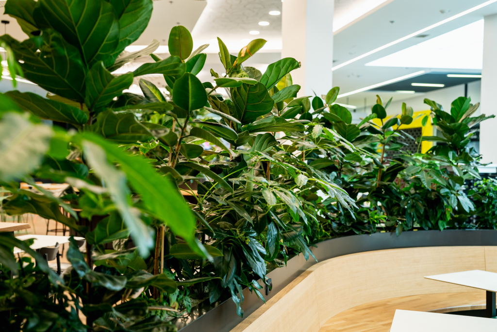 - výsadbu v záhonech, záhony jsou součástí nábytku Food Courtu a jsou umístěné po celé jídelní části