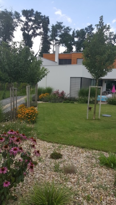 We set the functionalist villa in Sobotovice into straight and simple lines of the modern garden. The major part of the garden is a spacious grassy area divided from the house terrace by a line of ornamental grasses and perennials. We lined the driveway with an alley of plum trees.